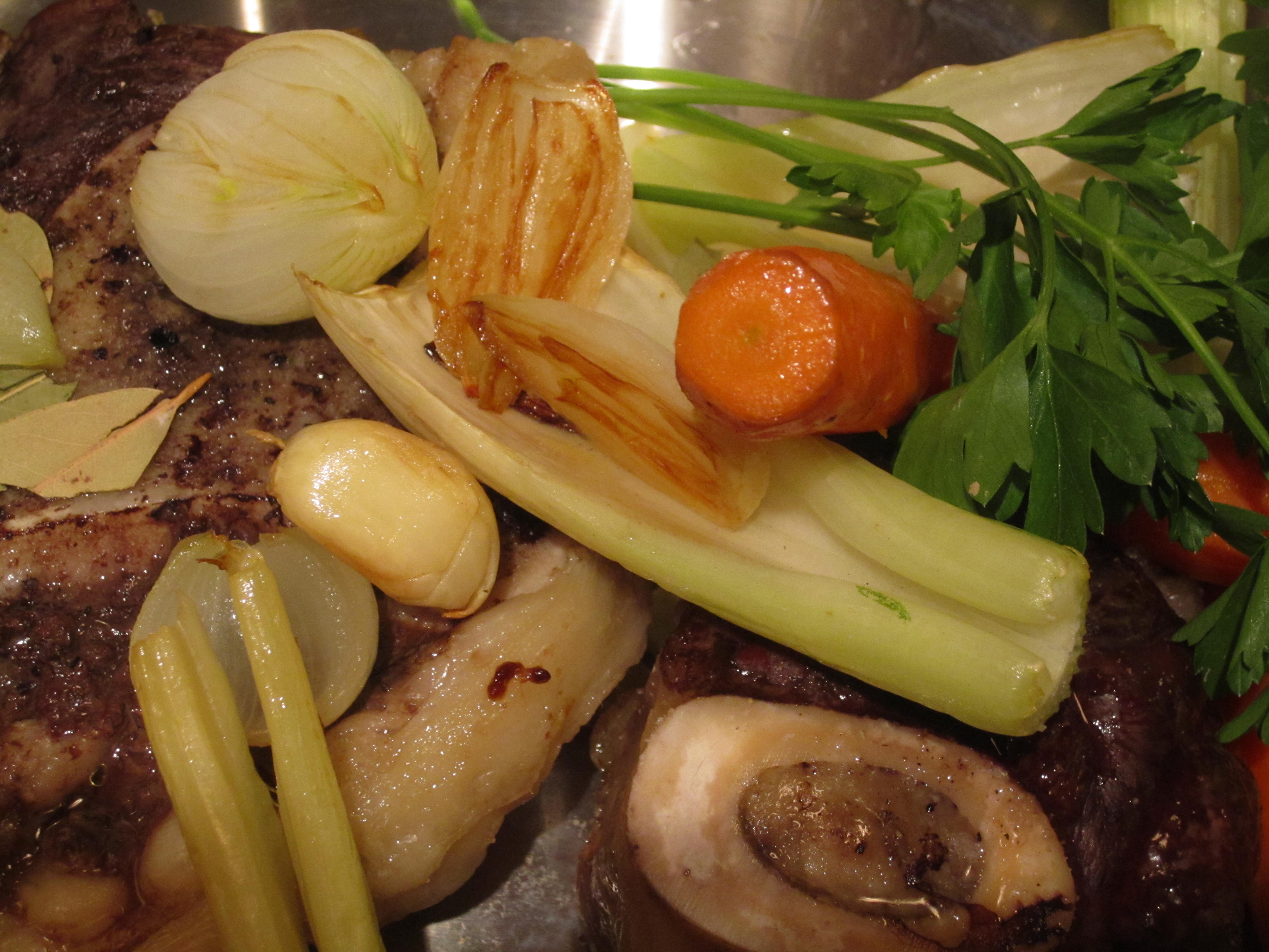 Preheat oven to 375°F/195°C. Assemble bones and meat in a roasting pan and put it in the oven. In the mean time peel and roughly chop into large chunks the onion, carrots, and celery (remove any leaves as they might burn). Place them in a lightly oiled roasting pan. Once the meat has acquired a light brown hue, at least 20 min, put the roasting pan containing the veggies in the oven alongside the other roasting pan. Continue roasting the meat and the vegetables for another 20 to 30 minutes. Be careful, we don’t want any black color only a beautiful caramelized tone on both the meat and the veggies. Once the desired color has been acquired, place the contents of both roasting pans in a pot and fill with 4-5 liters of COLD water. Add the rest of the ingredients, remember be wary of the salt as the liquid will reduce. Bring the contents up to nearly a boil and then reduce to simmer.
