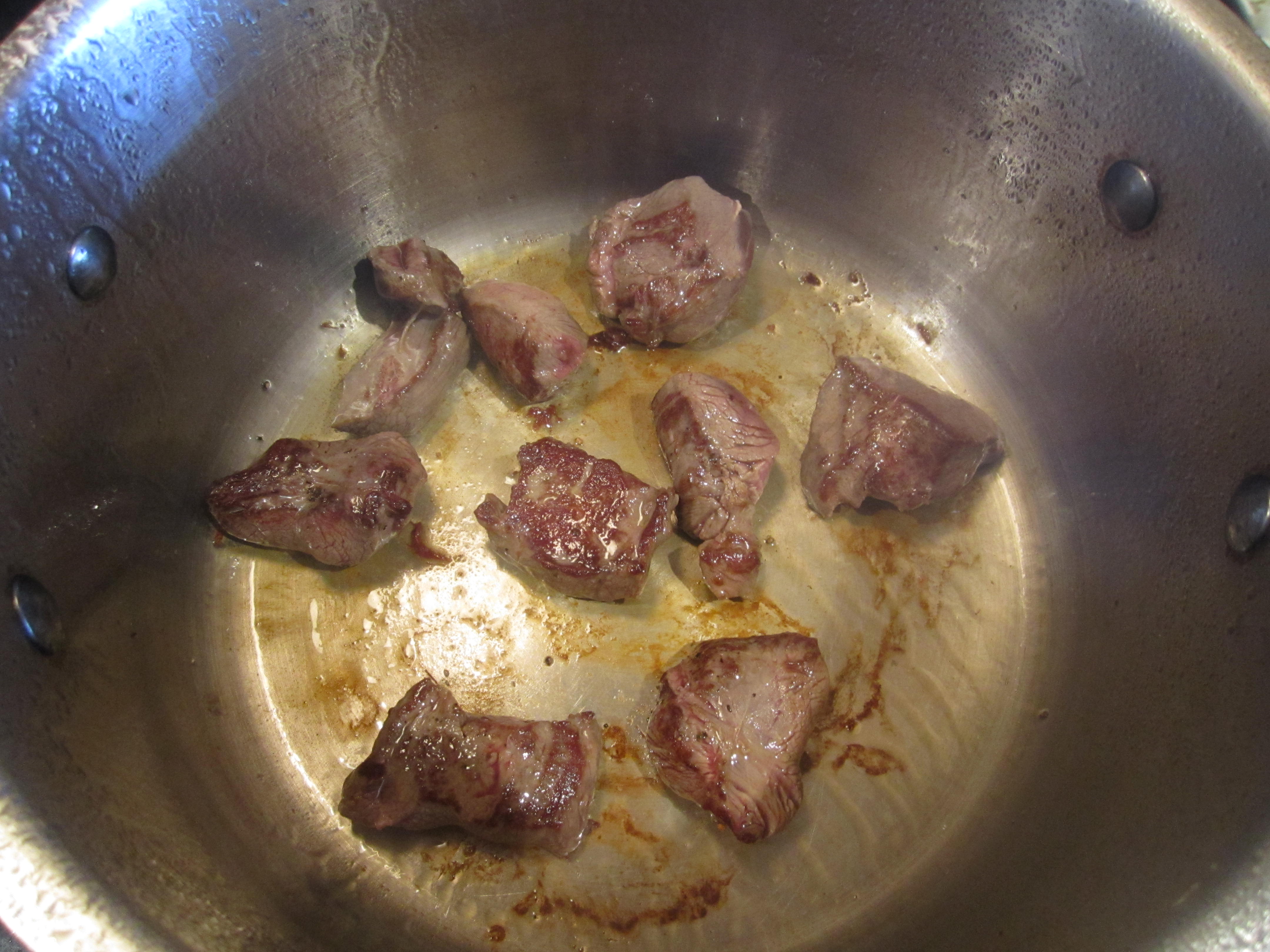 Make sure your meat is dry by patting it down with a paper towel. Season it with salt and pepper [if you are not trying to cut down on calories, toss the meat in flour, to coat all sides]. Heat oil in a large pot over medium-high heat. Add venison, and brown all sides, in small batches [this is the KEY to get beautifully browned meat: DO NOT OVERCROWD! Otherwise you will end up lowering the heat of the pot and won’t achieve that gorgeous brown color you are looking for].