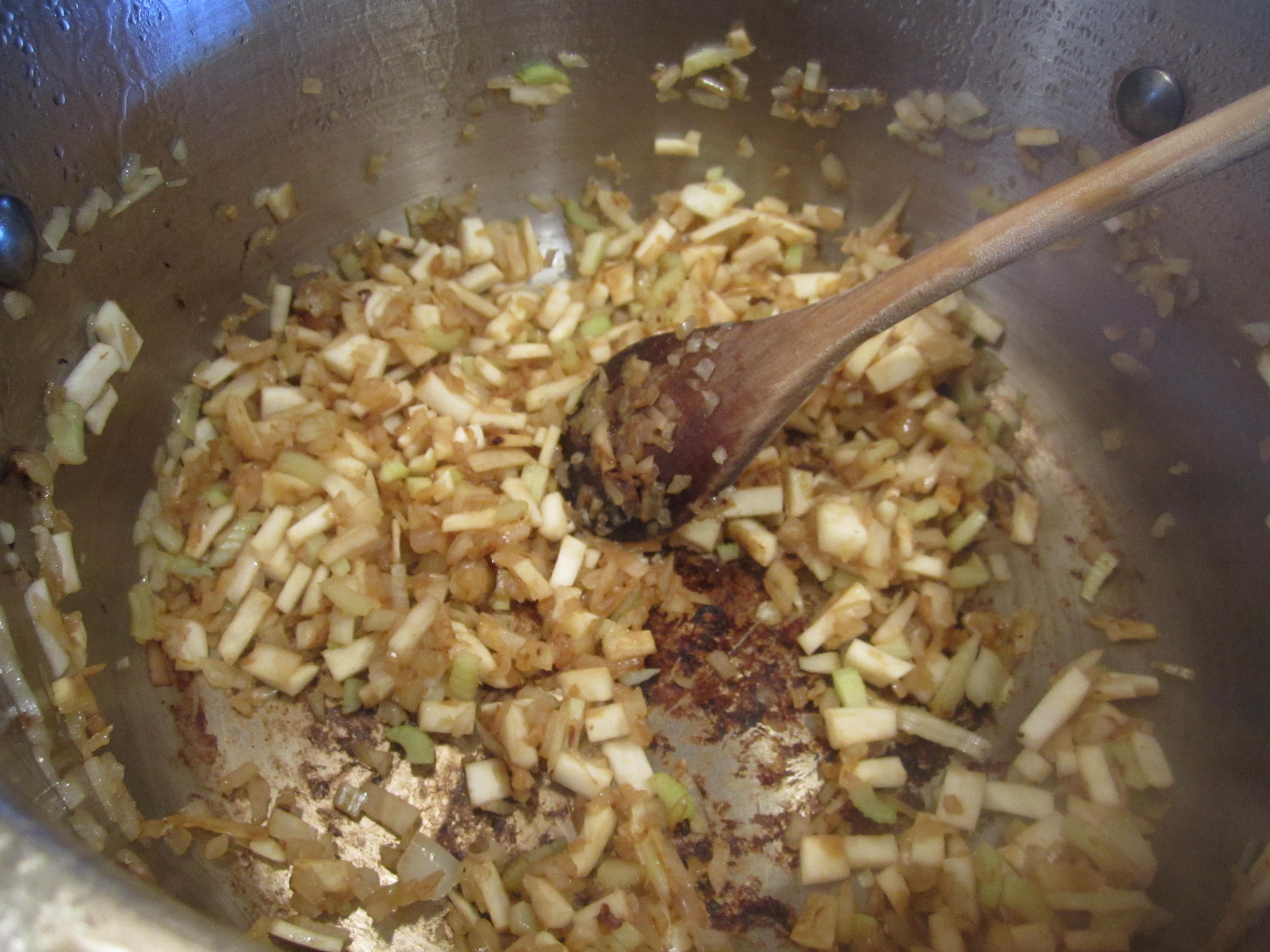 Transfer meat into a dish, sprinkle some dill and fennel seeds, and set aside. Reduce heat to medium and add one more tblsp of oil [or butter]. Add onion and saute for about 1 minute. Then add the rest of your mirepoix* [Instead of doing a traditional mirepoix I used onion, celery, and celeriac] and cook for about 4 min.