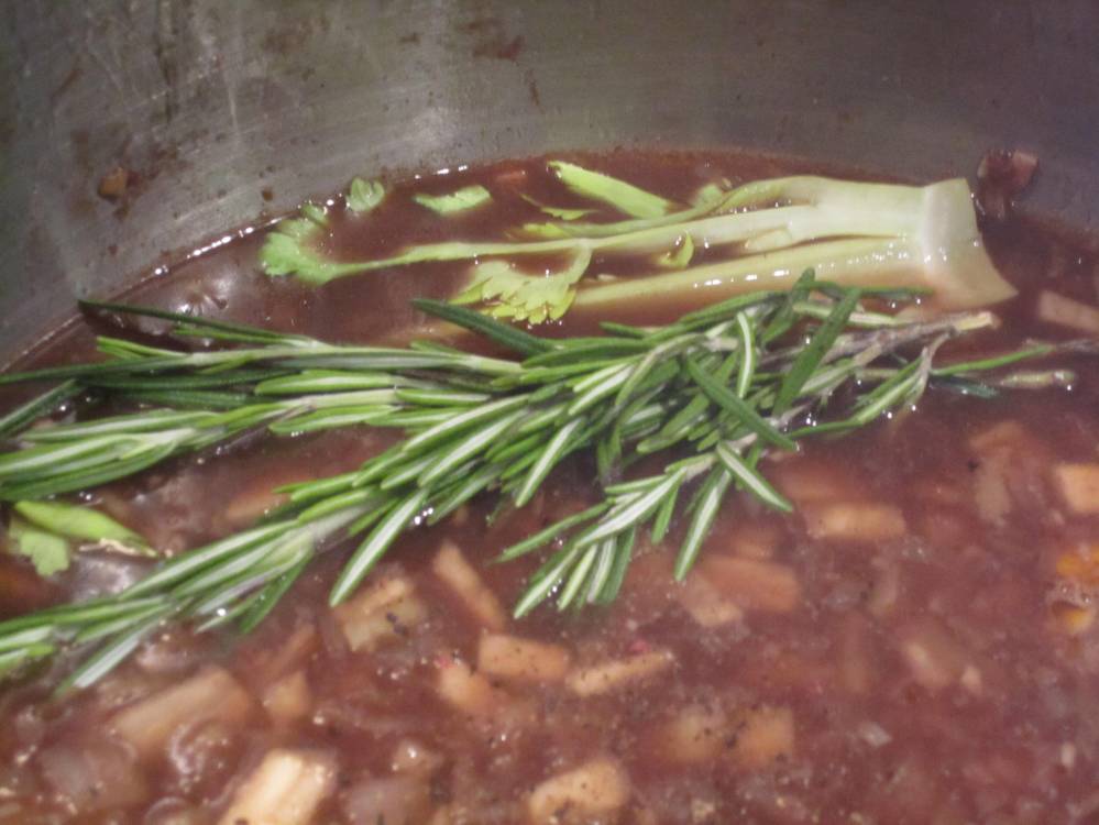 Add the garlic and cook until vegetables are soft. Stir in 1 tsp of tomato paste. Deglaze with wine. Once the wine has reduced to almost half its volume, add the demi-glace, stock, honey, rosemary, bay leaves, dill seeds, fennel seeds, allspice, and star anise. Season lightly. Once the mixture starts to simmer, reduce heat to medium low and let cook for 5-10 minutes.