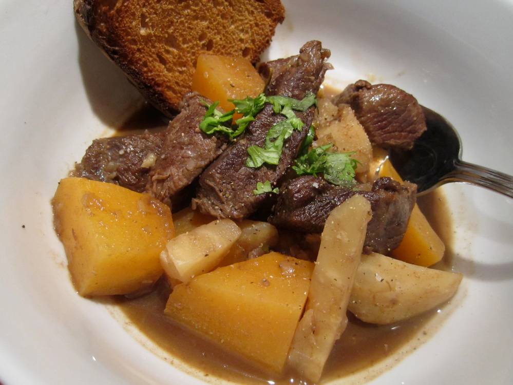 Add venison to the pot, cover and cook for about 1 hr [do not let the mixture boil, have it partially uncovered if necessary]. After this time has elapsed, add the turnips. After about 5-8 minutes add the celery root [normally turnips take longer to cook than celeriac]. Cook until vegetables are cooked to through, about 20 min. Taste and rectify the seasoning. Serve and garnish with parsley.