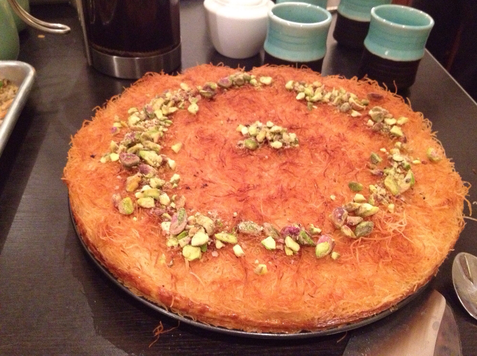 Let kunafa stand for 10 min before serving. Invert the kunafa unto a serving platter. Decorate with ground pistachio. You can pour the simple syrup over the entire kunefa or let guests drizzle on their individual portion.