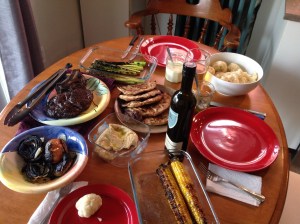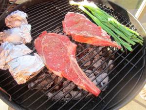 Steak- take the meat out of the fridge so that it is close to room temp by the time the grill is hot. For delicious steaks you really don’t need much. I simply rub a little oil and generously sprinkle salt (both kosher and Maldon salt) and pepper on both sides.